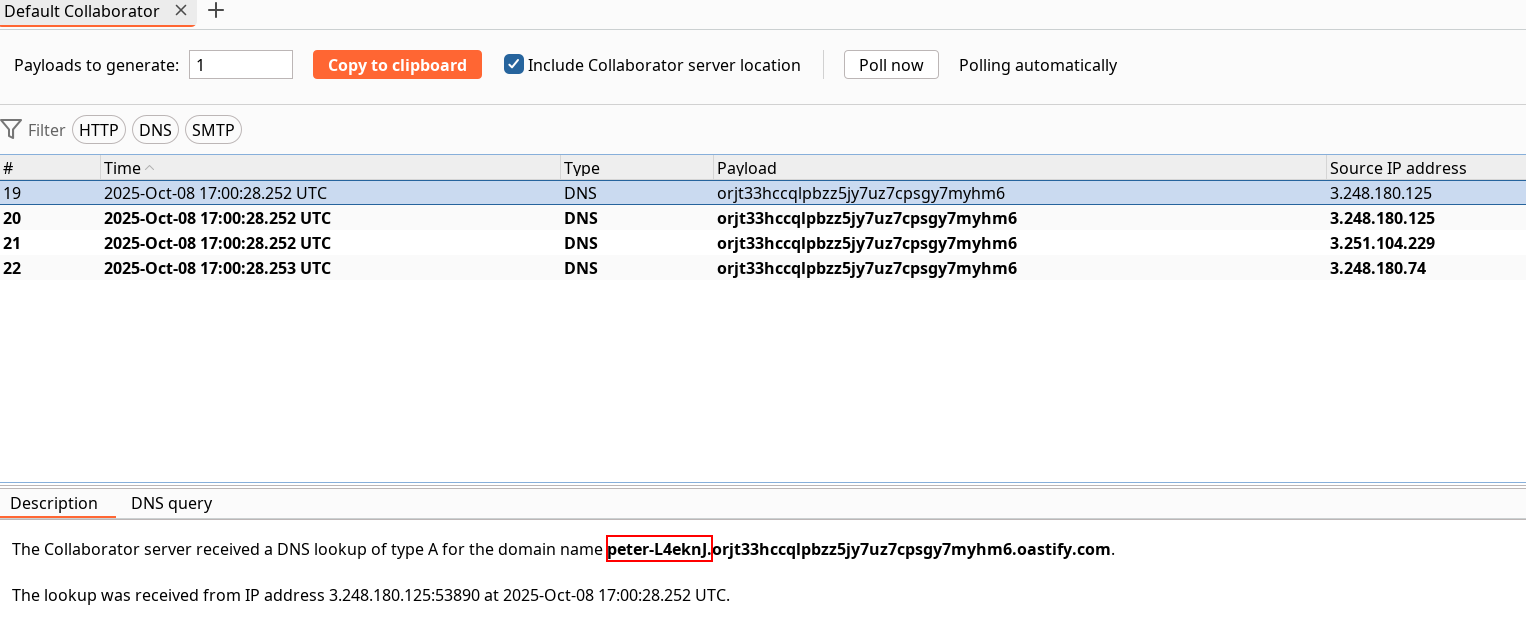 Our goal is to exfiltrate the name of the OS user. So our command should send the output of whoami in the request to our Collaborator. Many tools allow this but ping might be the most common, though maybe flagged if used by the server. dig, getent don’t trigger the vulnerability as opposed to host, nslookup,ping.