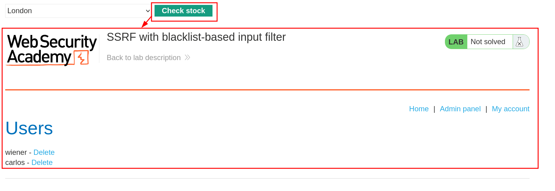 To solve the lab, change the stock check URL to access the admin interface at http://localhost/admin and delete the user carlos.