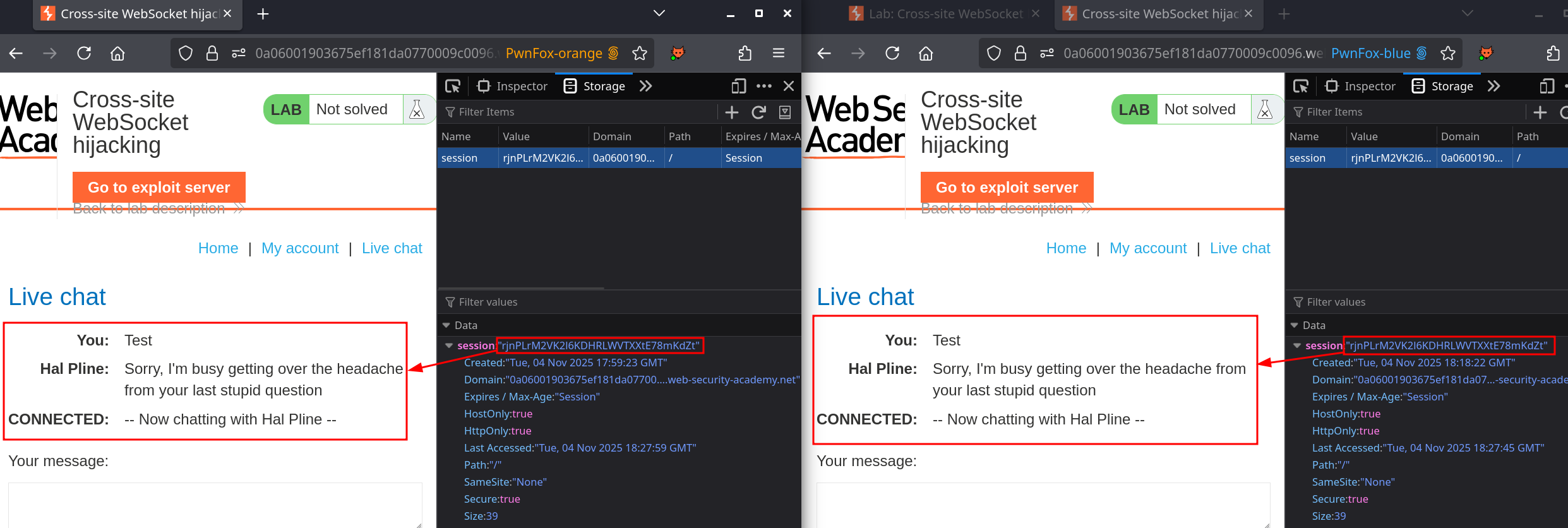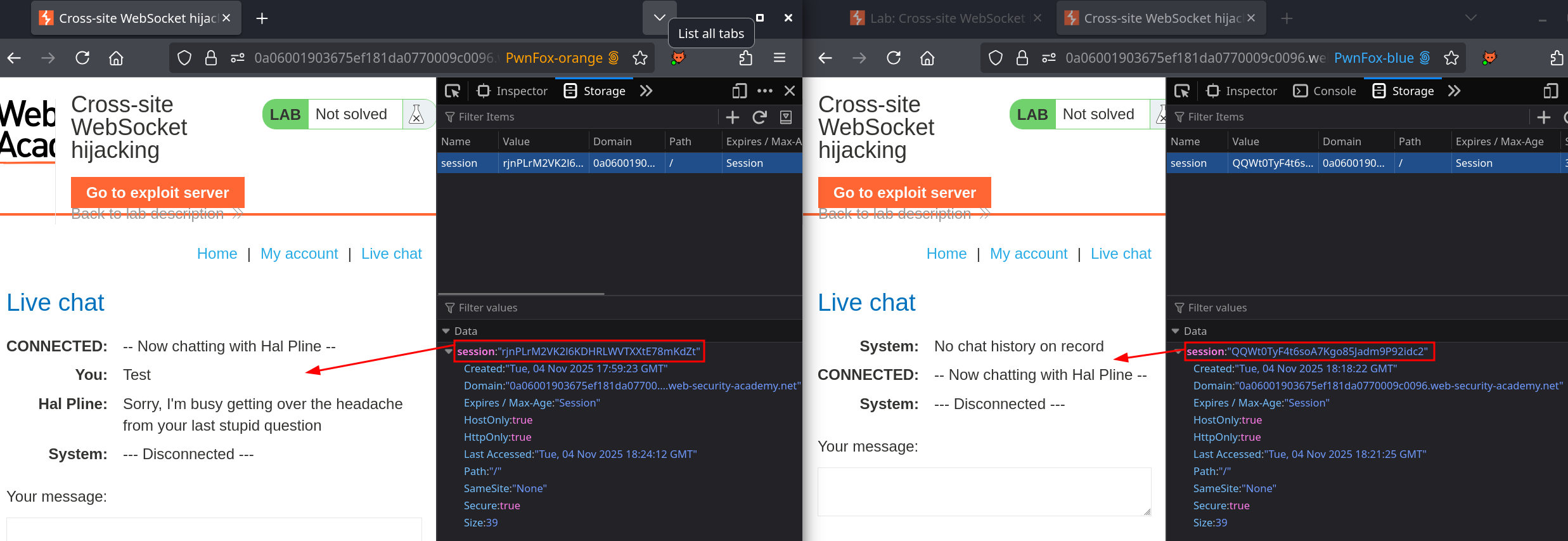 Sessions seems to be setup using only the session. I verify that by start a new pwnfox container and get on the live tchat, and noticing the two tchat with different session cookies are separate. If I edit my session to match the one of the first container, I end up on the full tchat. Note there is nothing that seems to tie my action but the session cookie on the Switch Protocol handshake.
