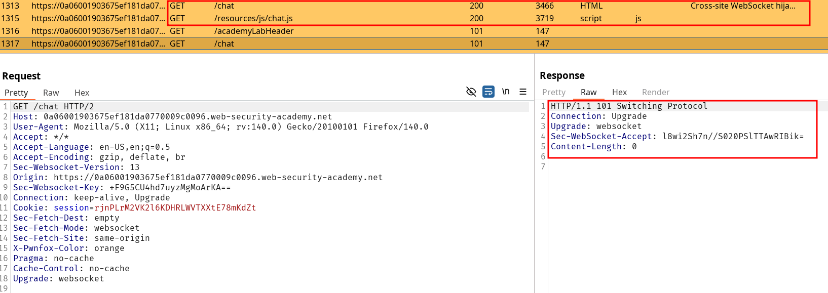 To solve the lab, use the exploit server to host an HTML/JavaScript payload that uses a cross-site WebSocket hijacking attack to exfiltrate the victim’s chat history, then use this gain access to their account.