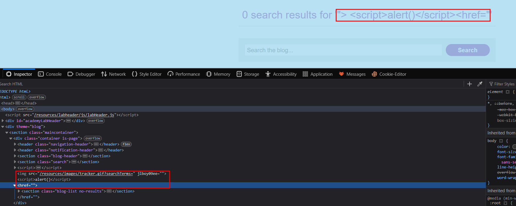 We see that our output is inserted directly in the DOM without filtering or URL escape, from this moment we can simply close the quote, bracket of the IMG tag and insert our script right after :
