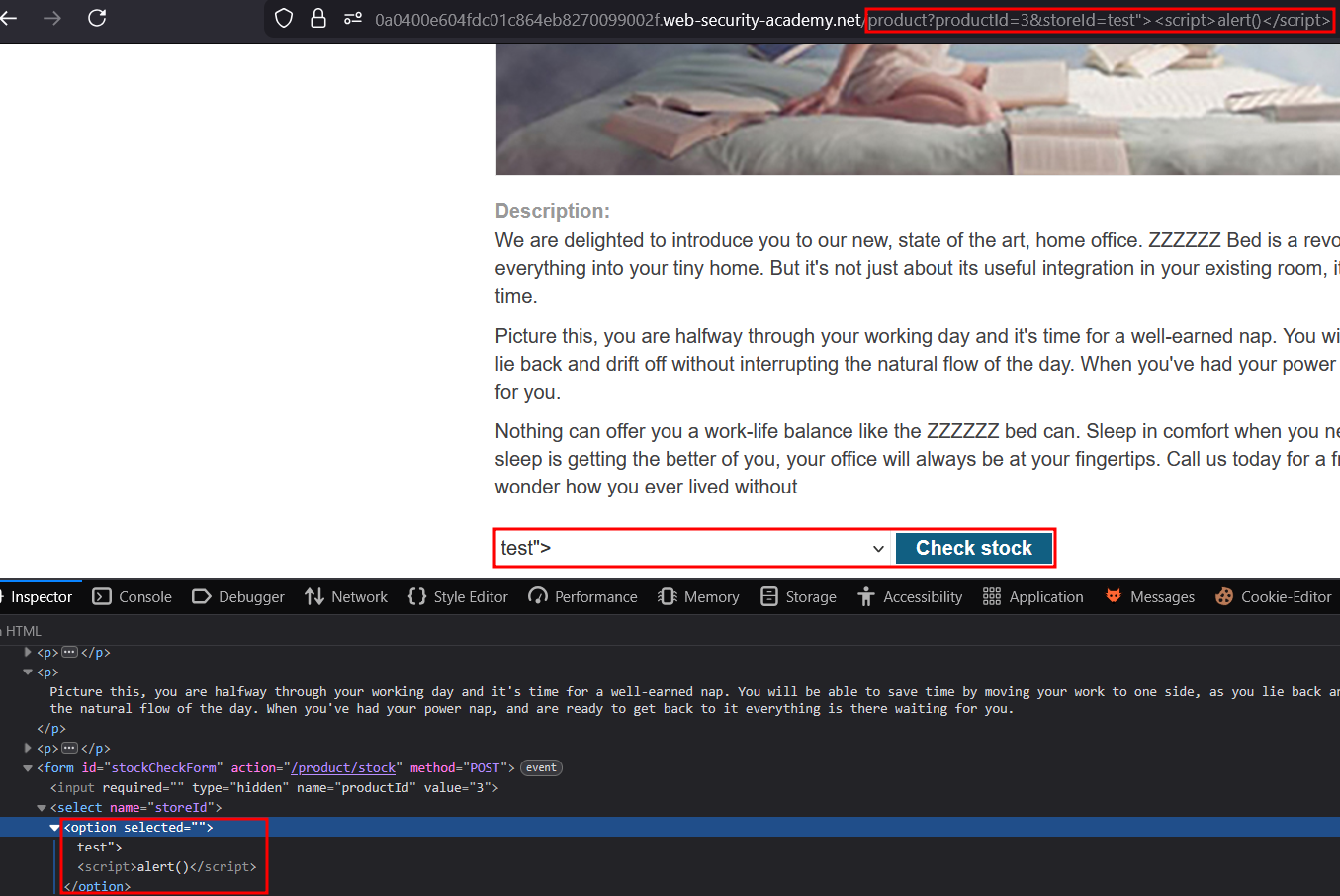 This is particularly strange since there is no way of triggering that naturally on the website, other than adding the parameter in the URL ourselves. However, it looks like totally intended to solve this lab so I’ll just craft a GET request by adding &storeId=somevalue"><script>alert()</script> to the URL :