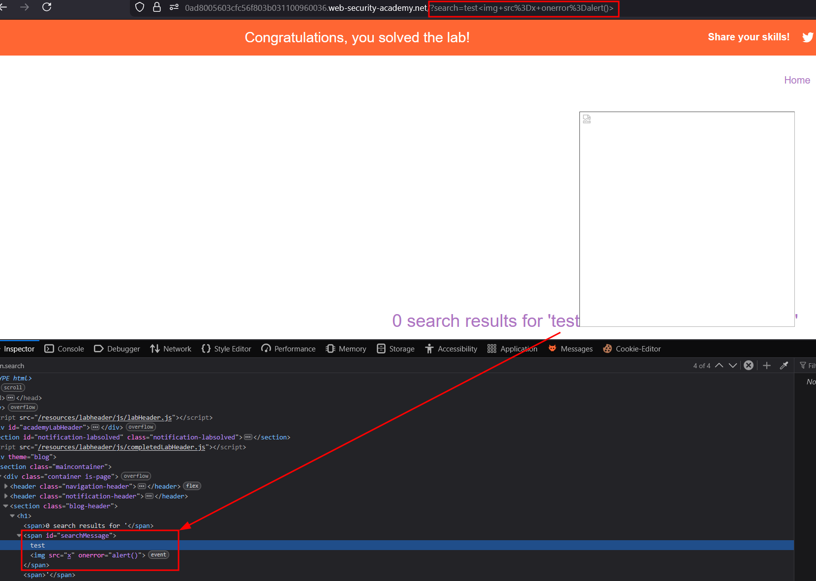 Simply put, our input is inserted in the webpage through the URL search parameter. Since this time it’s innerhtml, script are not working and we need to use an img tag such as :