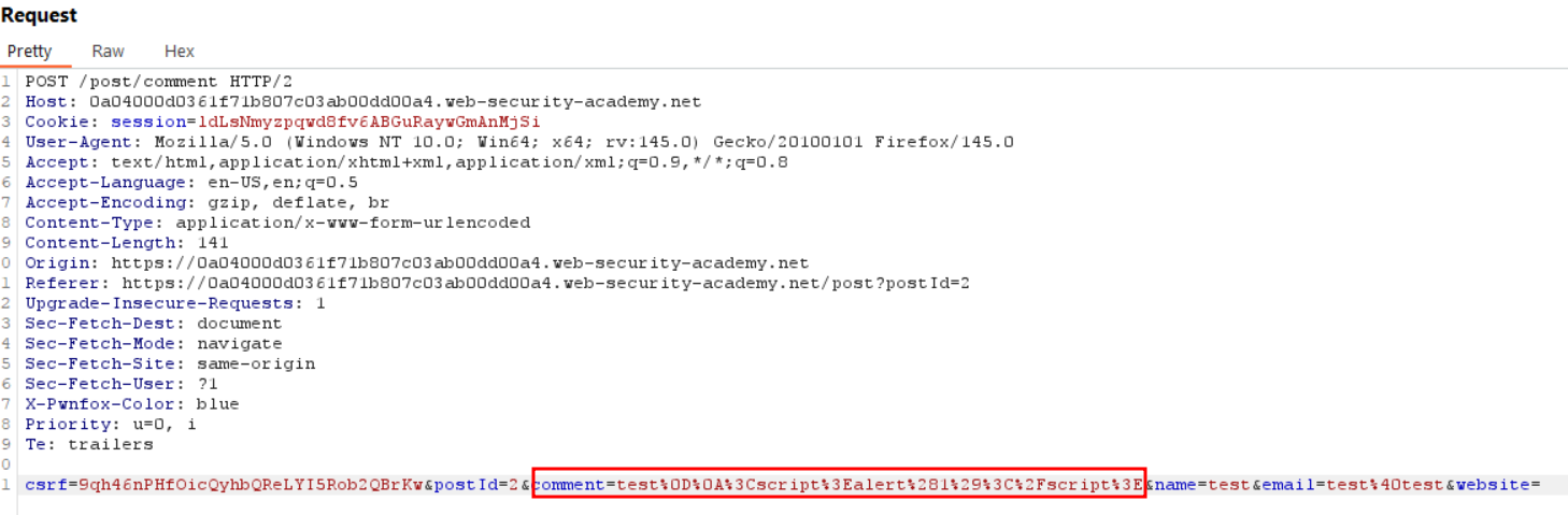 Straightforward if you read the Lab description. Go through the first post and insert a payload in the comment section. Here I just sent the payload in the comment section, however when you have such features, I’m usually trying a genuine one, check the request and then insert a payload in every input possible.